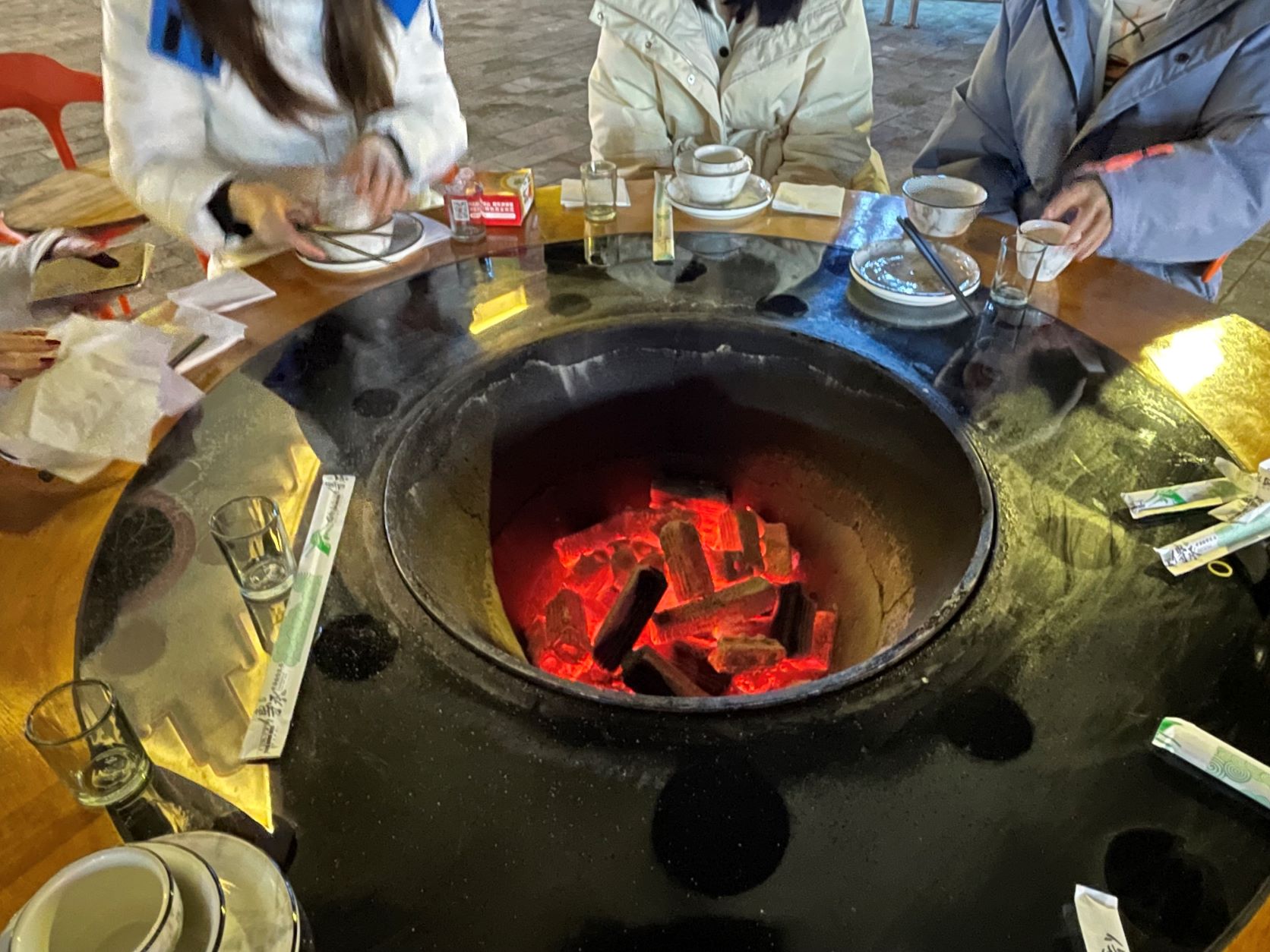 烤著(zhe)炭火(huǒ)等菜上(shàng)桌